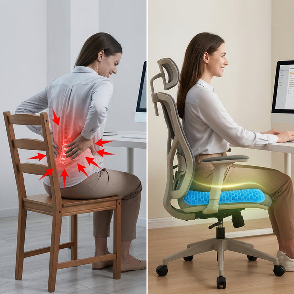 Il cuscino rivoluzionario in gel a nido d'ape ultra-traspirante. Progettato per chi siede a lungo, garantisce supporto lombare, freschezza costante e sollievo immediato da sciatica e dolori al coccige.